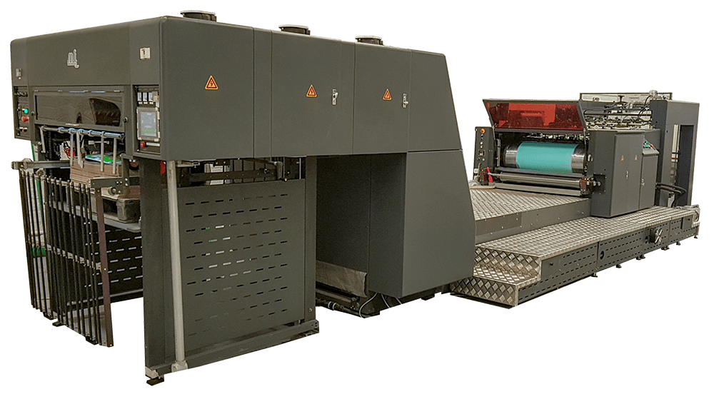 Marca MARVI INTERNACIONAL®. Barnizadora con alimentación automática de alta velocidad. Aplica barniz en plasta o a alto registro, en papel o cartulina con precisión de 0.25 mm. Sistema de transporte de hoja por barras de pinzas. Horno de secado IR (infrarrojo) y horno de curado UV (ultravioleta). Cuenta con inversor de frecuencia. |